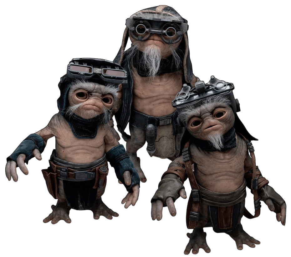 One of the most famous Anzellans was the legendary shipbuilder, Shug Drabor, who helped develop the Chandrila Star Line’s popular MPO-1400 Purgill-Class Star Cruisers. Another was the infamous droidsmith, Babu Frik, who gained galactic relevance given his role within the Sith Eternal’s collapse leading up to and during the Battle of Exegol. Small groups of Anzellans could also be found on planets like Nevarro and Vespaara around 9 ABY, the latter hosting the “Scrap Salvage” competition within the Hunters of the Outer Rim’s “Grand Arena.” Most Anzellans usually had a similar manner of dress, with simple robes or loincloths that exposed much of their skin, seemingly due to the work-intensive tasks that they devoted most of their time to. They almost never wore shoes, although they were usually seen with some sort of complex goggle apparatus on their heads that seemingly protected their sensitive eyes during welding while also honing their already impressive sense of sight.