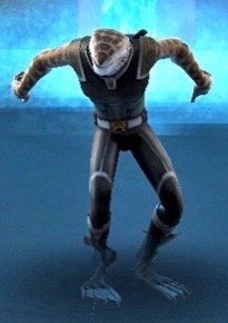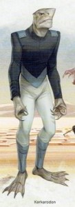 Biology: Karkarodon were shark-like sentient humanoids hailing from the oceanic world of Karkaris. They had light colored abdomens and faces, often tan or white, while their backs, arms, and legs could be one of a number of much darker colors, with a variety of mottled spots and lines giving each a different design and appearance. The differences in appearances apparently depended on what underwater biome the species developed in, as different environments required different forms of camouflage. Karkarodon were carnivorous predators, relying on a strict diet of meats, and they often had no qualms about consuming other sentient species, dead or alive.