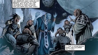 Many thousands of years after their encounter with the Kwa, and approximately four thousand years before the Clone Wars, an “Old Republic” exploration team finally reached Iktotch. They were surprised to see that the Iktotchi has prepared for their arrival weeks in advance, setting up great celebrations, feasts, and even carving the Republic insignia into the planet itself. These explorers first mistook them for a long lost Republic colony, but eventually realized the Iktotchi simply had incredibly perception abilities, and reported their findings back to the Jedi Order shortly thereafter.