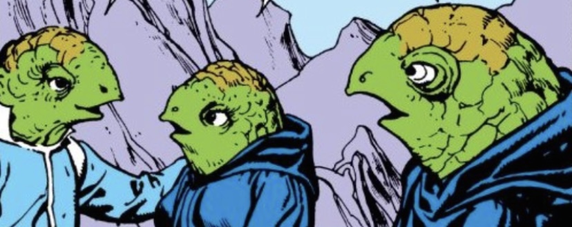 Biology: The Kadrillians were turtle-like semi-diminutive species originating from an unknown planet. They stood anywhere between 1.2-1.8 meters tall, with a slightly hunched posture (potentially due to a semi-formed “shell” hidden on their backs). They had a generally humanoid shape, being bipedal and possessing five-fingered hands. The majority of their skin was green although the tops of their heads were sometimes yellow. They had no real visible chin, with their wide necks running directly into their beak-like mouths. These mouths were pointed and showed no visible teeth. Directly above the mouth were the small nostrils, which could seemingly be closed at will. They had no visible ear canals, and their eyes were situated on opposite sides of their heads, giving them less than optimal monocular vision.