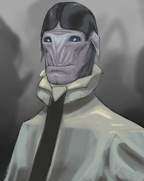 The Heptooinians face had components that gave it an almost canine-human hybrid-like appearance. Their mouths were wide and nearly lipless. They had a “V” shaped ridge on the front of their face in place of a visible nose/nostrils. Their eyes are set rather wide apart, with dark blue/purple sclerae and bright, almost glowing light blue irises. So far they have only been observed with fairly long black hair parted in the middle, but it is unclear if this is the standard or simply one of many colors and styles. Their ears were also pointed and drooped down from the side of their head.