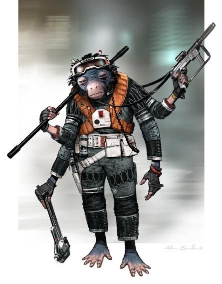Given their strength and agility, Ardennians were also just known for being incredible warriors, giving them fearsome reputations. It was seemingly common to see them in Imperial and New Republic prisons, and it was most likely that they were often these prisons’ top dogs. Ardennians were also known for their fondness of telling elaborate stories, as well as throwing large parties and celebrations. This included the famous “Mynock Roasts” of Ardennia. Ardennians enjoyed leisurely swinging across things, whether they be treetop branches or steel support beams, and they often spent just as much time hanging as standing.