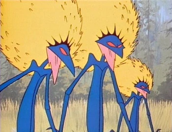 Fftssfft heads were flat, sporting beak-like mouths, jagged, sharp lips, and a fleshy pink interior. Their eyes were bioluminescent, often a solid red, pink, or purple in coloration. The top of their heads were covered in a large yellow plume that could take one of two shapes. One resembled that of a dandelion, while the other was much more reminiscent of mushrooms. These plumes actually consisted of millions of small needle-like petals, and one one hundredth of them were actually unique, known as “Star Urchin Quills.” The interspersed quills were highly venomous and could be shot at high speeds out of the Fftssffts’ head, blooming open upon impaling flesh and releasing high quantities of a toxin that could paralyze, or in some cases, even kill smaller species.