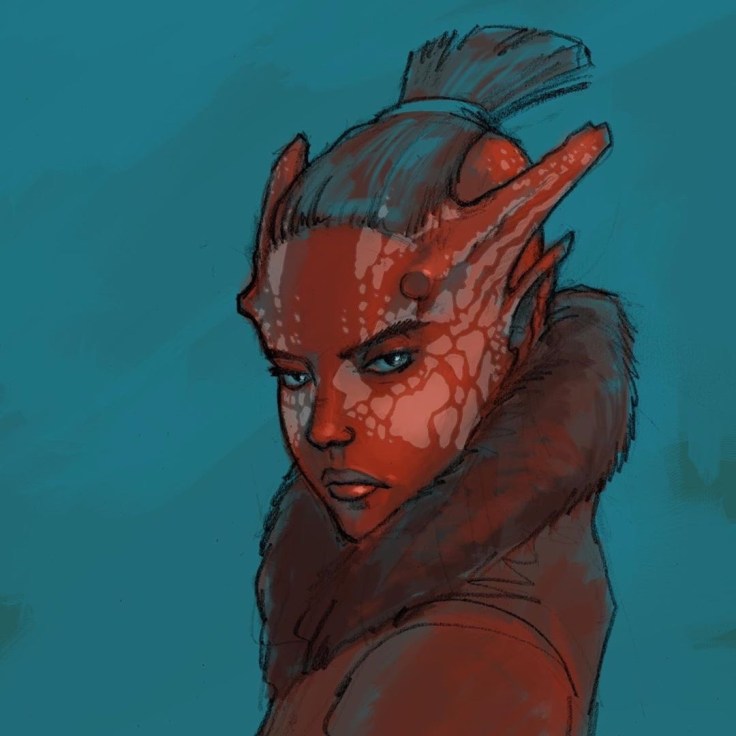 Biology: Kessurians were a species that were incredibly similar to Humans biologically. They were bipedal with the same general build, height, weight, and lifespan as the average Human. They did, however, possess a few distinctive traits. These unique characteristics included red or burgundy pigmentation with tan spots and markings found on their arms and face. They had pointy, elf-like ears, yellow, orange, or silver irises with small black pupils, and horn-like “Montrals” protruding from both their foreheads and the sides of their heads, with the former horns having a stump like appearance while the latter were fully pointed. Kessurians also grew reddish-brown brown hair between and behind these Montrals (although not on the sides of their head) that turned gray with age, with male Kessurians also possessing the capacity to grow full beards.