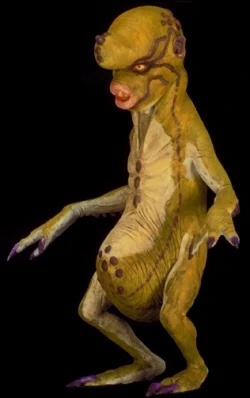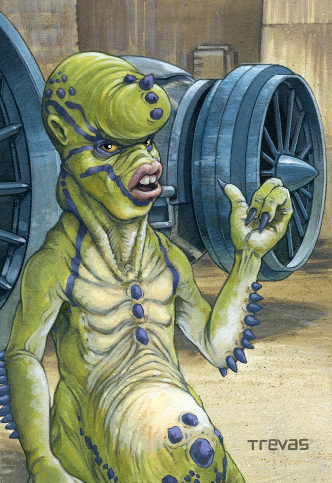 Lore: Fluggrians were originally native to the wet, marshy world of Ploo IV. They were actually considered a highly evolved and advanced species, developing complex floating cities and technologies, and evolving beyond the need for clothing as it inhibited the advanced sensory organs found all across their bodies. Unfortunately, the Fluggrians were also known for being disagreeable, corrupt, and notoriously xenophobic, harboring a particular hatred for their neighboring species, the Glymphids, as wel as contributing greatly to galactic crime. Fluggrians had unique styles of architecture and technology, with noticeable trademarks and doors and seats slightly too small to properly accommodate the average humanoid.
