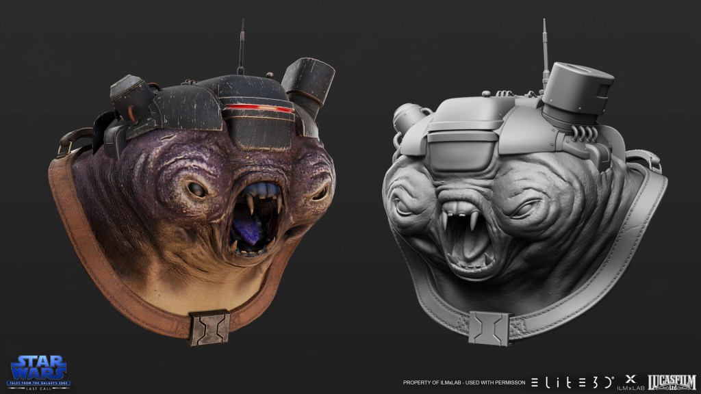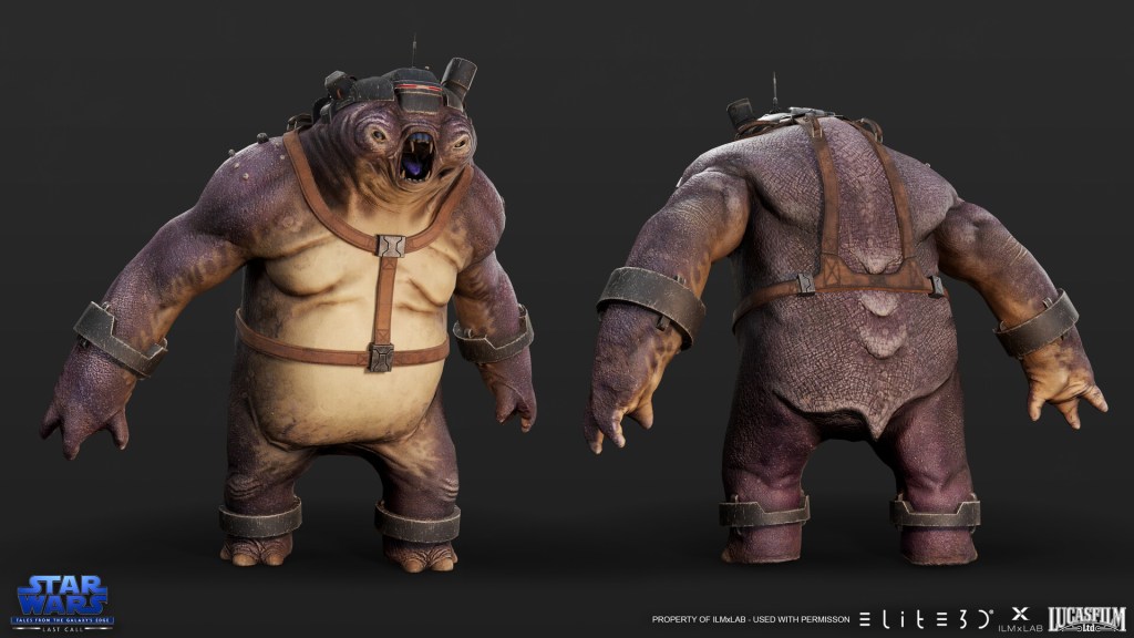 That incident aside, while I have not yet played the VR experience that introduced us to the species, “Tales from the Galaxy’s Edge – ‘Last Call,’” I do technically have access to it and will definitely get around to it someday. I was also very excited that they got highlighted in the surprisingly informative children’s animated series, “Star Wars: Galaxy of Creatures,” on StarWarsKids.com and YouTube (again, the one that I’m pretty sure originally contained a fairly big inaccuracy), and I do encourage you to check it out if you want to see more about the species’ mannerisms and such! In fact, the first row of images below come from the short spotlighting them, while the second row features the TftGE in-depth character model taken straight from “2K Valencia” Character Artist Fernando Estrela’s ArtStation portfolio, which is also worth a visit! (And the third row comes straight from the VR experience itself!)