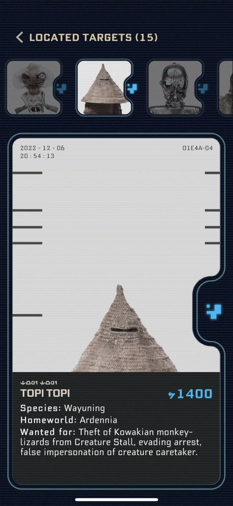 Continuity: The Wayunings are exclusive to Star Wars Canon, introduced within Episode IX: The Rise of Skywalker but not named until one of them, a Kowakian Monkey-Lizard thief named Topi Topi, was featured in the rather obscure Disney Play app minigame “Batuu Bounty Hunters,” useable only at the Galaxy’s Edge theme parks.