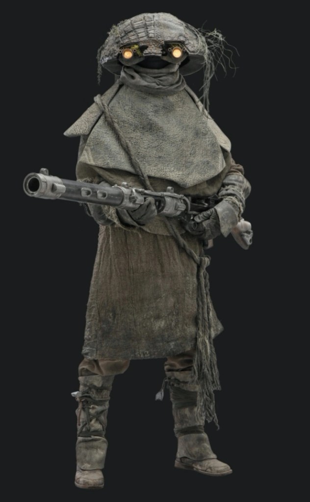 Lore: Little is known about the Alazmec, a fact they seem to perpetuate. The entirety of the species seemed to wear full body outfits consisting of loose wrappings, long sashes and mismatched pieces of cloth, and the wide, almost bowl-like helmet with goggles mentioned above. These getups were usually earthy browns and grays in coloration, and it was common to see twigs and leaves secured to their helmets, giving off the impression that they were always attempting to camouflage themselves, regardless of surrounding. The species had been discovered and introduced into the galaxy by the height of the Galactic Civil War, and were known for their proclivity for wielding long rifles. They also seemed to have a reputation for being expert marksmen, and at least one Alazmec by the name of Loriach, became a legendary sniper and member of the Assassin’s Guild.