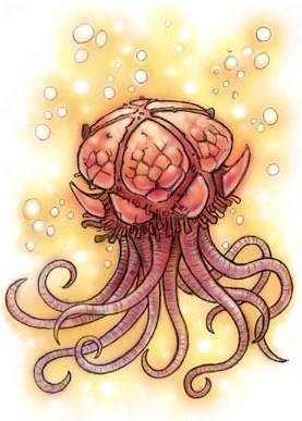 On their underbelly appeared to be some sort of mouth-like opening, protected by a beak or beak-like tooth. Surrounding this tooth was a cluster of small, disheveled tendrils ranging broadly in shape, length, thickness, pointiness, and direction of protrusion. Bypassing this nest-like feature were anywhere from four to around ten longer prehensile tentacles that could grow to approximately twice as long as the species’ body bulbs, making up a majority of their “height.” While their smaller tentacles could be red or pink, these longer ones were often striped, ranging from yellow to brown to red to black in coloration. It is not entirely clear what function the opening on their underbelly served, as they seemingly lacked vocal chords, though it could have assisted in feeding and/or breathing.