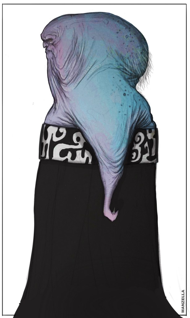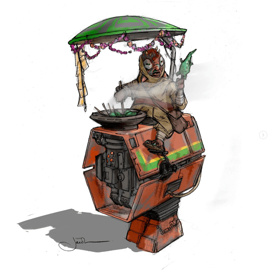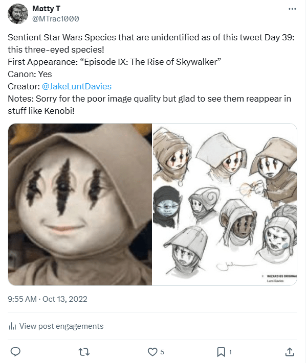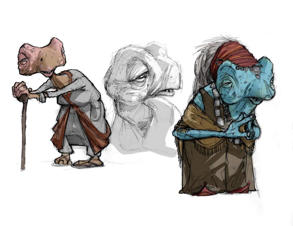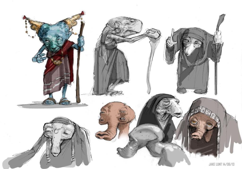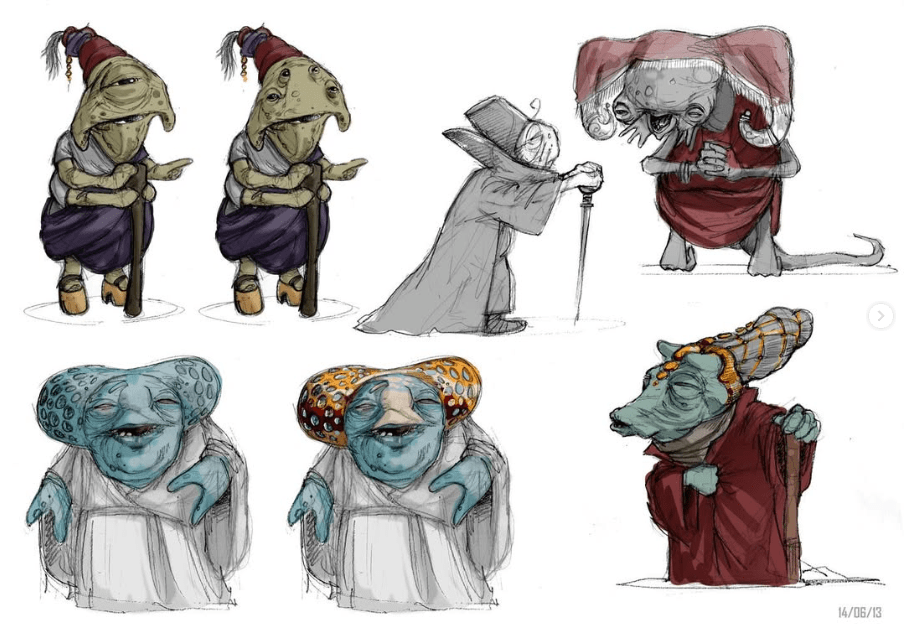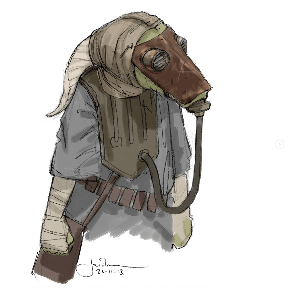 DAY 30 UPDATES: I spoke with Jake Lunt Davies who confirmed the first instance of the species seen in TROS was based, at least in part, on one of his designs, which he shared about on Instagram. Something interesting to note is that the costume departments almost always adapt JLD’s designs 1:1 into live action, so this seems like an odd case of excess changes. When asked if his design might have been merged with another from a separate artist, he said he wasn’t sure and couldn’t remember everything about the process, however, it was definitely possible that this could have been a case of a “double credit” or that Neal Scanlan and team may have made last minute adjustments to make the costume screen-ready in time for filming.