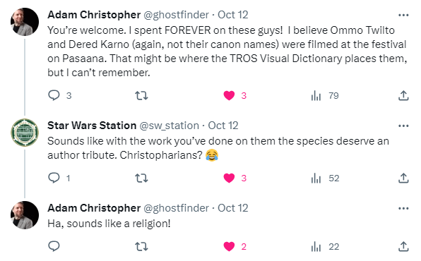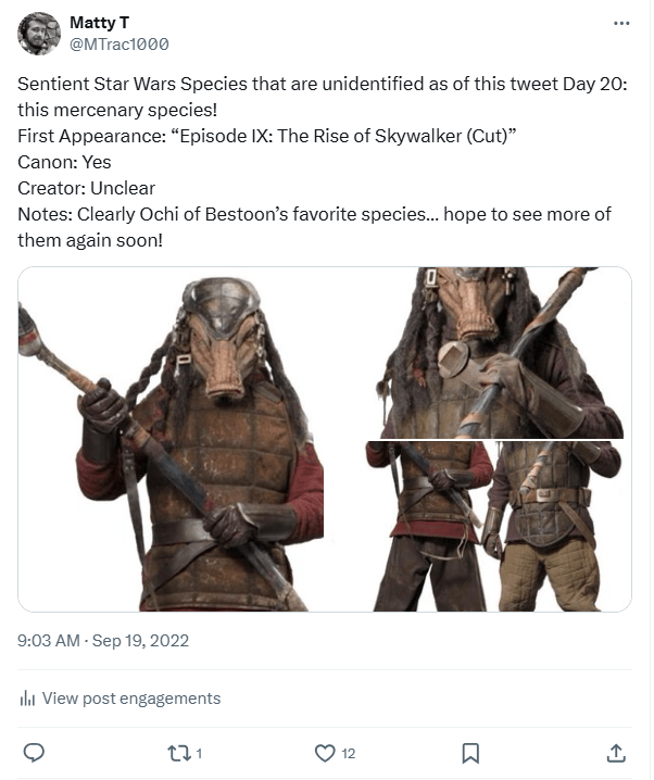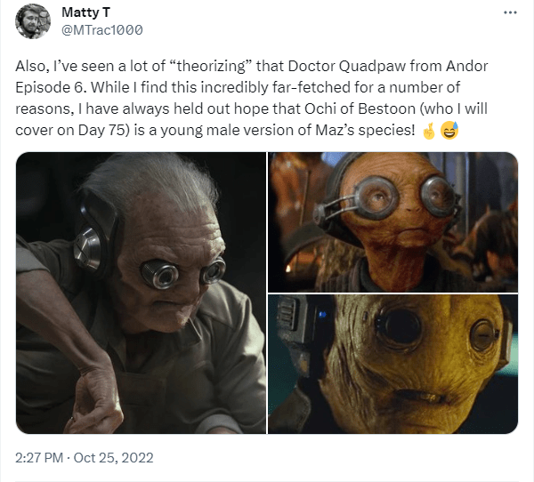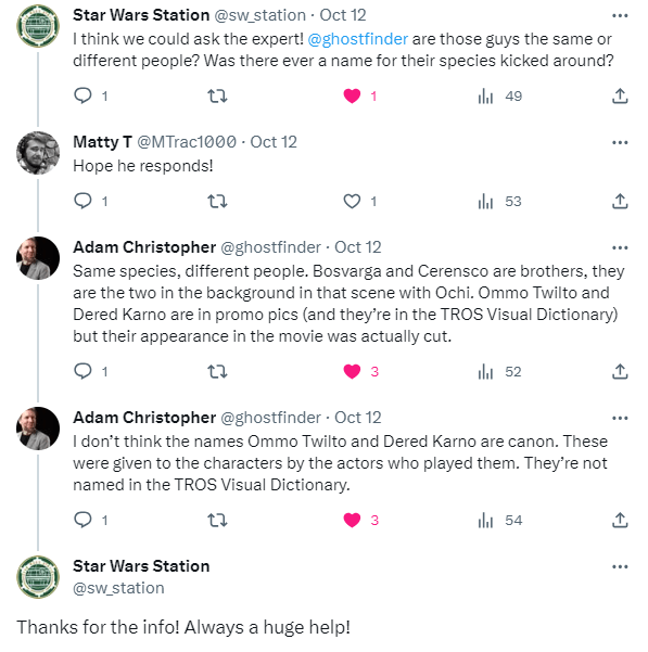 DAY 20 UPDATES: So, I do have to make a correction to make, although the tweet I made announcing this correction sparked some additional confusion, as well as a couple of answers. For starters, this species was NOT cut from The Rise of Skywalker, just the specific characters above. During the flashback scene where Ochi of Bestoon confronts Rey’s parents, two individuals belonging to this species can be seen in the background.
