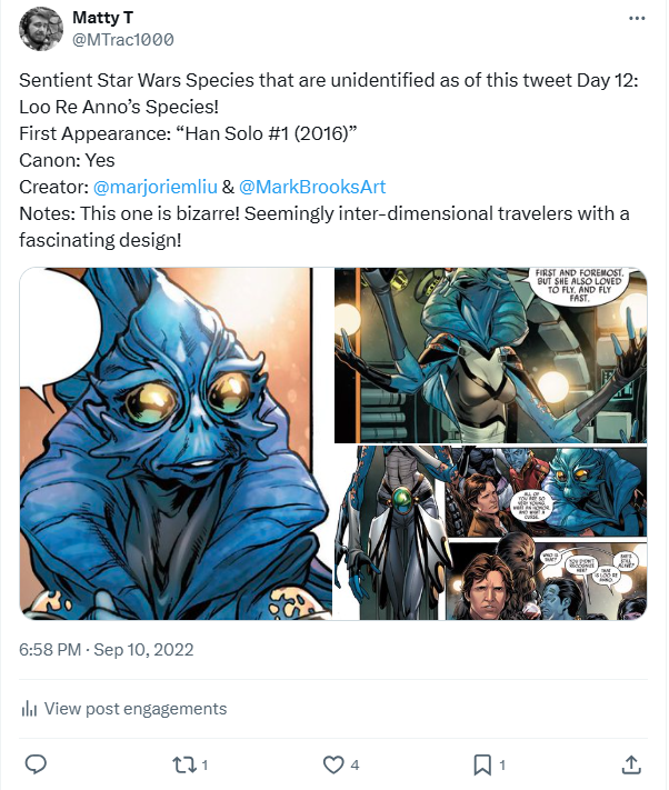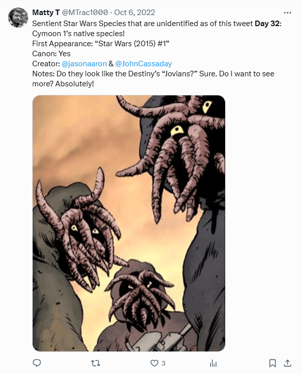 DAY 29 UPDATES: I didn’t have the resources I do now (over two years later) when making this post, so I didn’t get to read over the entire comic beforehand. That said, this species has pretty wildly varying appearances, so I’ll show the third member below. We also know their current “homeworld” is Yorn Skot, specifically the floating platforms surrounding it, though they were obviously colonists, so we still do not know where they originally hailed from.