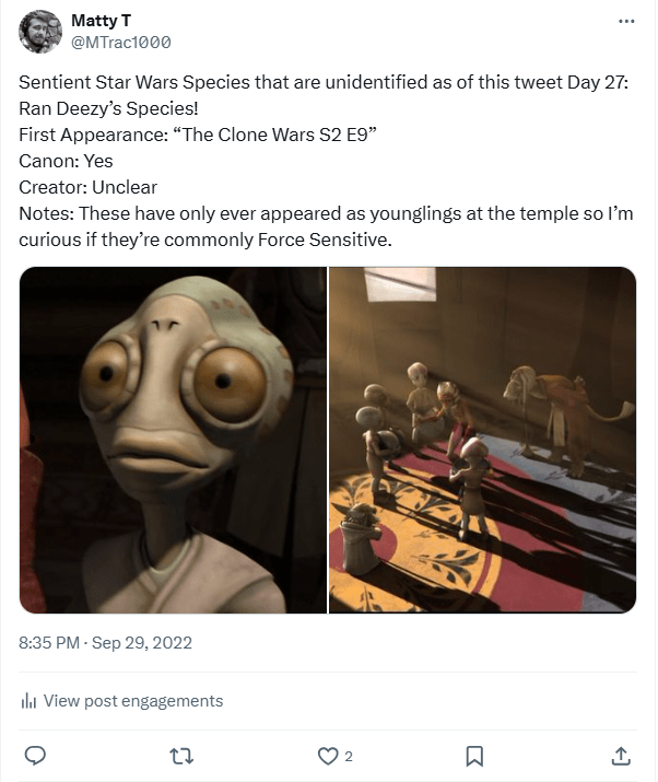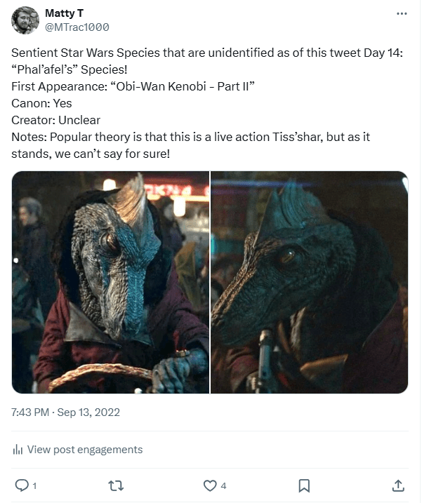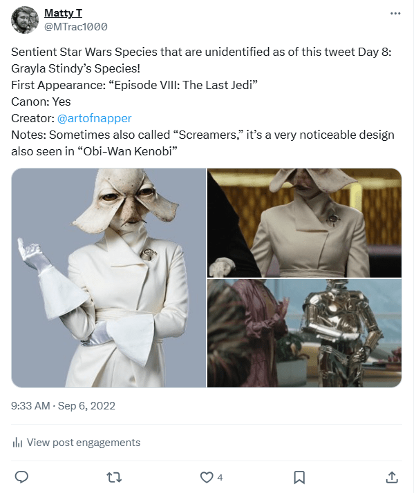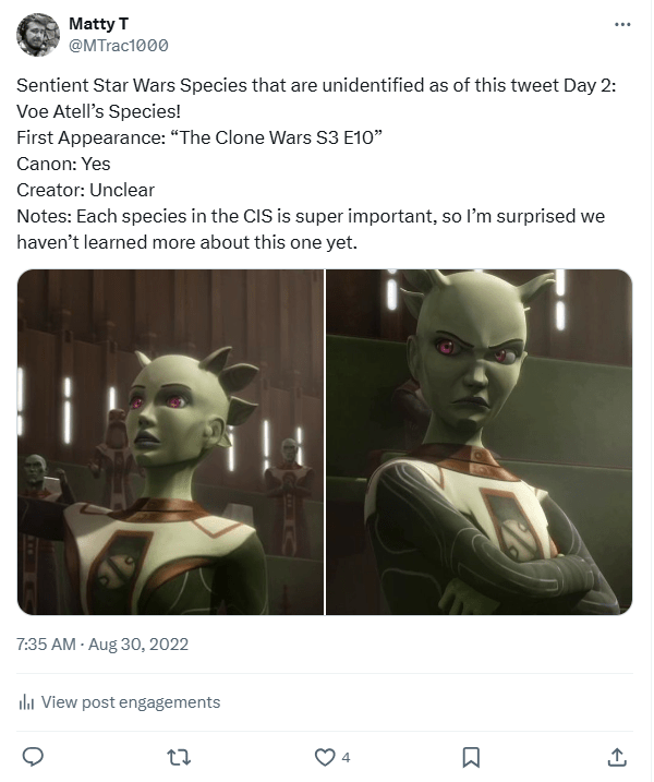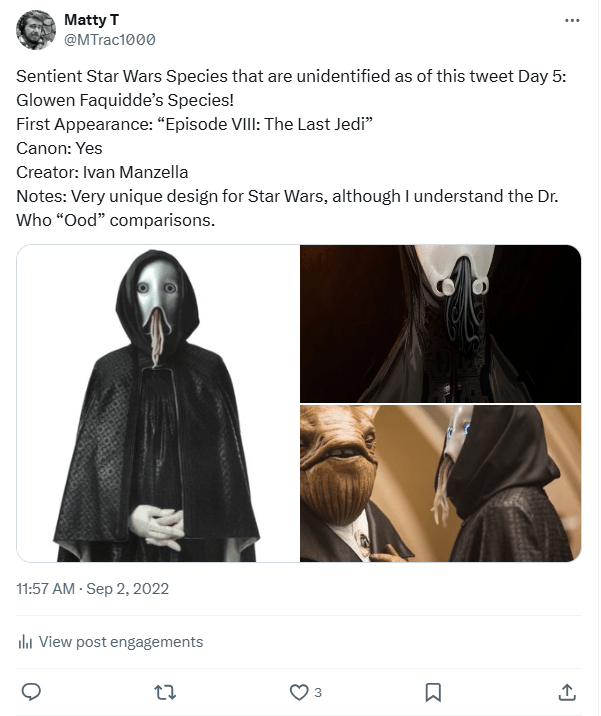 And we finally got a name for the species! The day after they made their animated debut within The Bad Batch, the official Episode Guide on Starwars.com for TBB Season 3 “Identity Crisis” revealed in the trivia that this species is known as the “Tarlafar!” (A Tarlafar Jedi also briefly appeared in “The Acolyte” shortly after they were named, which I thought was a fun inclusion!)