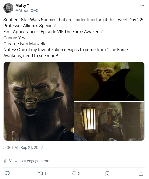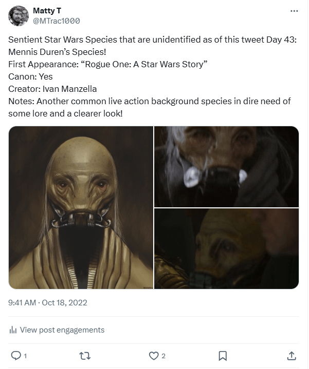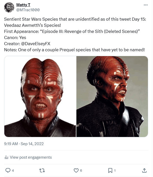 DAY 15 UPDATES: It is worth noting that their homeworld was stated to be “Sarrish” in Star Wars Legends, though that doesn’t give us many clues as to their official name in Canon, as the world has only been mentioned in passing canonically and has yet to be re-linked to this character/design… additionally, while the Legends Wookieepedia page for this species already existed, I was given the privilege of making the Canon one, found here: https://starwars.fandom.com/wiki/Veedaaz_Awmetth%27s_species. (Also, there are claims this species was originally based on concept art for Palpatine, though I have yet to come across it yet.)