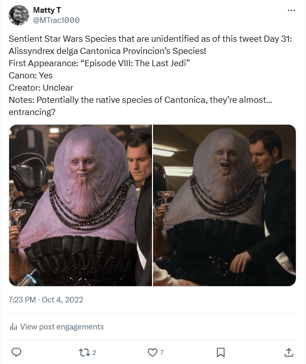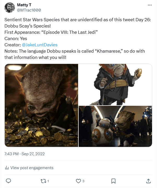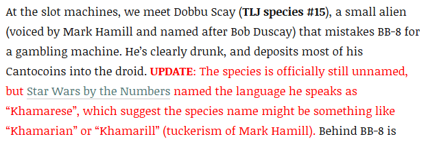 DAY 26 UPDATES: In the 2024 Comprehensive Encyclopedia, this species was revealed to be the “Khamarill” from “Emkhamarill,” a species name that was actually predicted by Whiphid (aka Dr. Kevin) over on Alien Anthology! The species, planet, and language are all loose anagrams of Mark Hamill’s name, who voiced and I believe did the mocap for Dobbu Scay in “Episode VIII: The Last Jedi!”