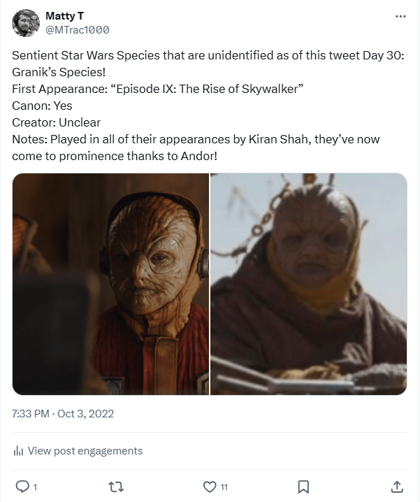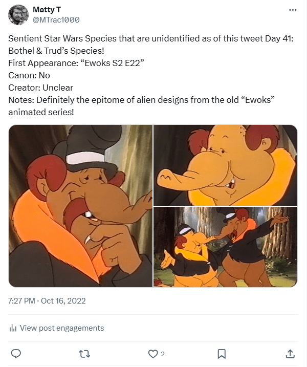DAY 41 UPDATES: Oddly enough, this species was mentioned by the “Keeper of the Holocron,” Leland Chee, who included them in a graphic of various sentient “Elephantines” across Star Wars, intended to showcase that the Ortolan, Max Rebo, and Neel from “Skeleton Crew” belonged to two distinct but similar species. Unfortunately, nothing else came out of this for this particular species, and no identification or hints were dropped.