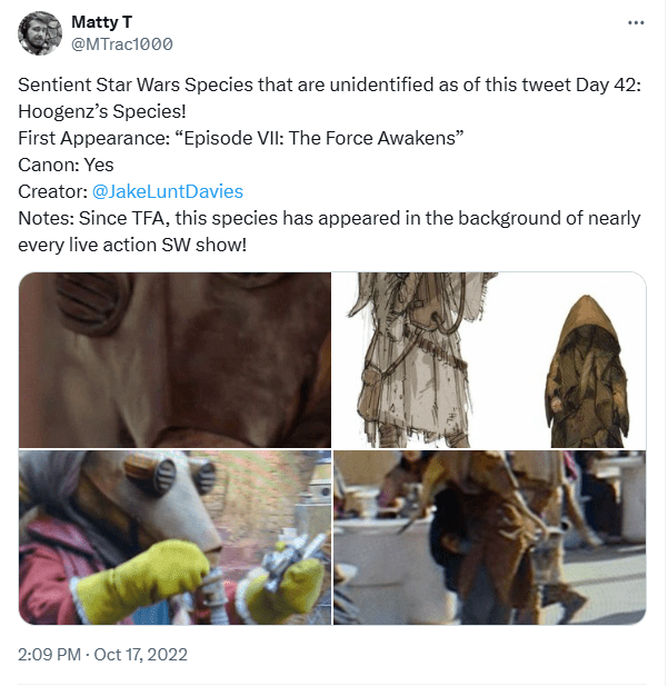 And finally, it turns out Leland Chee had dropped the name of this species in the comment section of a JLD Instagram post, identified as the Buktari. Additionally, it was uncovered that two members of this species can be seen in TFA, Hoogenz and Anoonda, and based on additional notes Chee dropped when asked about them, it seems the picture I included in the upper left of the initial post that I referred to as Hoogenz, as, in fact, the latter individual.