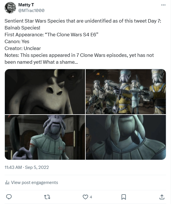 DAY 7 UPDATES: There’s still an ongoing dispute over whether the species, in fact, named the “Balnab” or not. It has been framed in a way where this seems to be true, but lore-wise, it still just doesn’t make sense, as only a handful of members of this species were stranded on the planet Balnab after a crash landing. This is why sites like Wookieepedia have been hesitant to solidify this, instead acting as if just this one group of castaways are the Balnab, and not the entire race overall, which I believe is wise until they’re further referenced in something else someday.