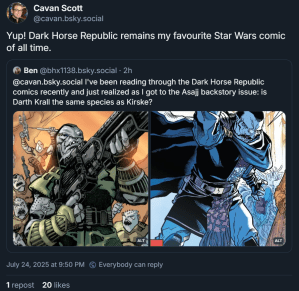 DAY 40 UPDATES: Cavan Scott revealed on Bluesky that this is actually a Vollick, a species originating from Legends in 2004’s “Republic #60.” Additionally, as a note going forward, Darth Krall’s true name when he was a Jedi was Radaki, so for future entries I will be straying away from using titles in posts if actual names have already been been revealed.