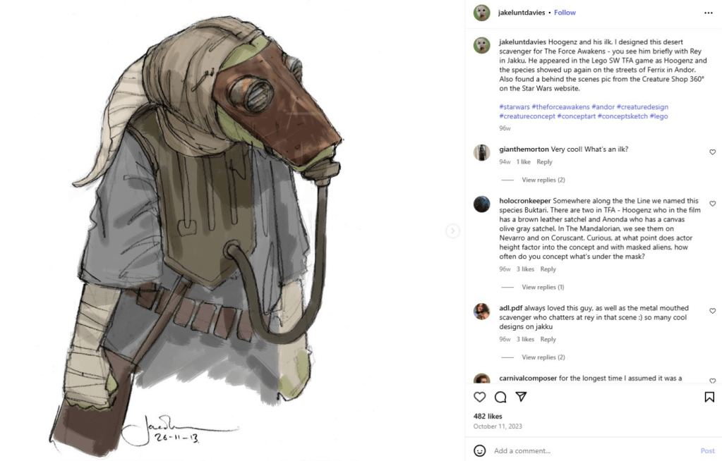 DAY 42 UPDATES: Jake Lunt Davies helped me find an additional behind-the-scenes look at the costume! I also came across another piece of his concept art for the species that gives us a slightly closer look than the one I included within the initial tweet!