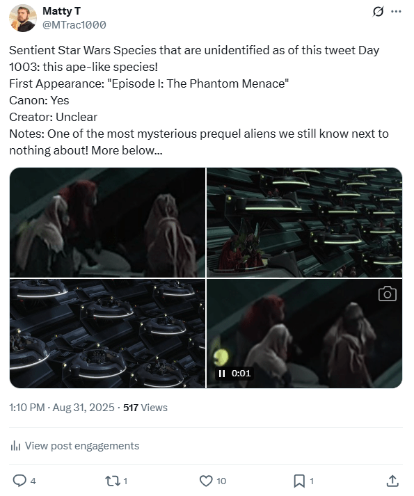 Another species enthusiast that sometimes assists with the series also reached out to Steve Molin, ILM’s Sequence Supervisors and Development Lead during TPM, asking if he had any knowledge, and he told them that the species were essentially just kitbashed from random elements with little rhyme or reason under the supervision of the legendary costume-maker Anne Polland, who passed away back in 2001, and taking any additional knowledge with her. Molin did reveal that they were generally portrayed by random ILM staff, including himself on one occasion, but that’s where the revelations end. I’m currently not at liberty to share the exact screenshots of this conversation, though I hope you can take my word for it. For further info, refer to the Wookieepedia page I made for the species here: https://starwars.fandom.com/wiki/Unidentified_ape-like_species.