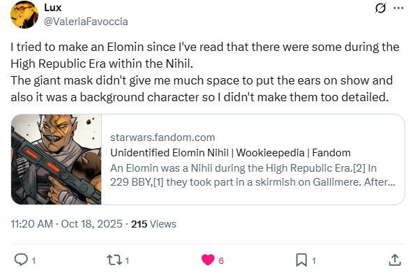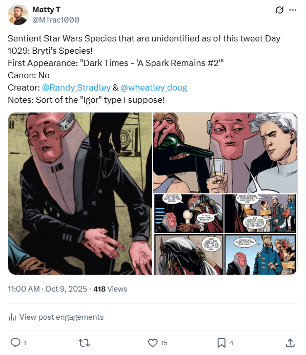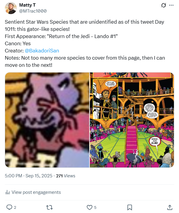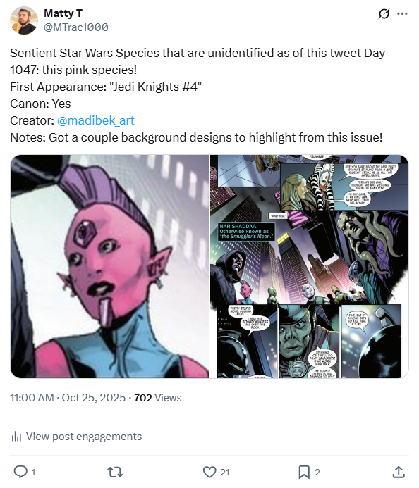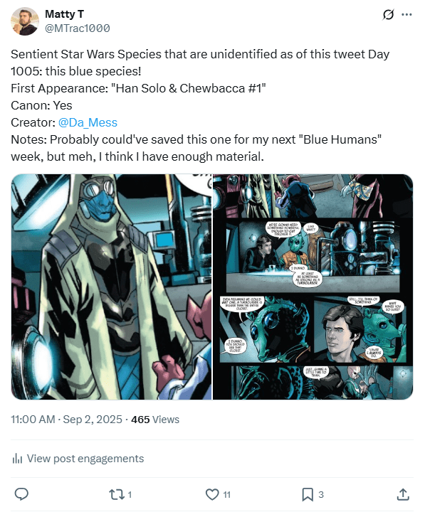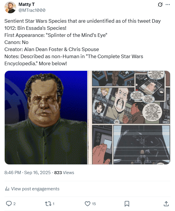 DAY 1012 UPDATE: The species technically fell within the updated notability policy on Wookieepedia I helped establish, so here’s the article I created: https://starwars.fandom.com/wiki/Bin_Essada%27s_species
