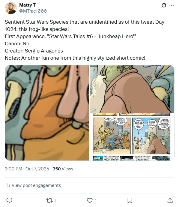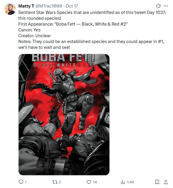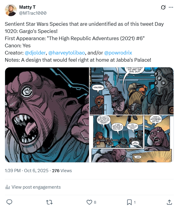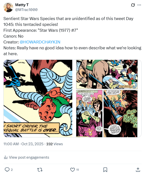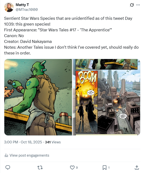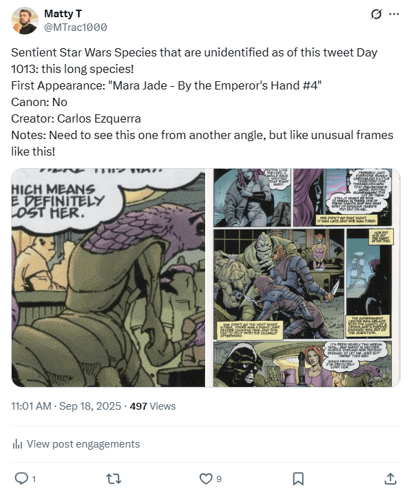DAY 1049 UPDATE: It appears the general community consensus is that this is a Dug, and despite not being able to see their torso which would 100% determine, I can’t say I even disagree. Everything in this issue is a bit spikier than it should be, and there are a ton of actual unidentified on later pages, so lets go with that for now.