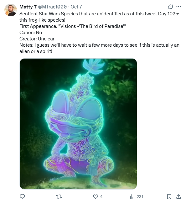 DAY 1025 UPDATE: This is a unique case… not actually an alien, as I honestly should have predicted given their appearance, but instead seemingly a manifestation of the Force or Force entity in some capacity. Non-biological and only existing within a vision, though not a figment of the imagination I don’t believe. Up for interpretation for sure, but I don’t believe “alien” is a valid interpretation outside of something to do with the Whills I suppose, and even though, their nature as a “species” or pantheon of microscopic aliens is dubious.