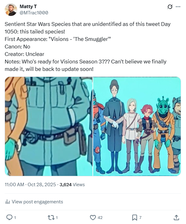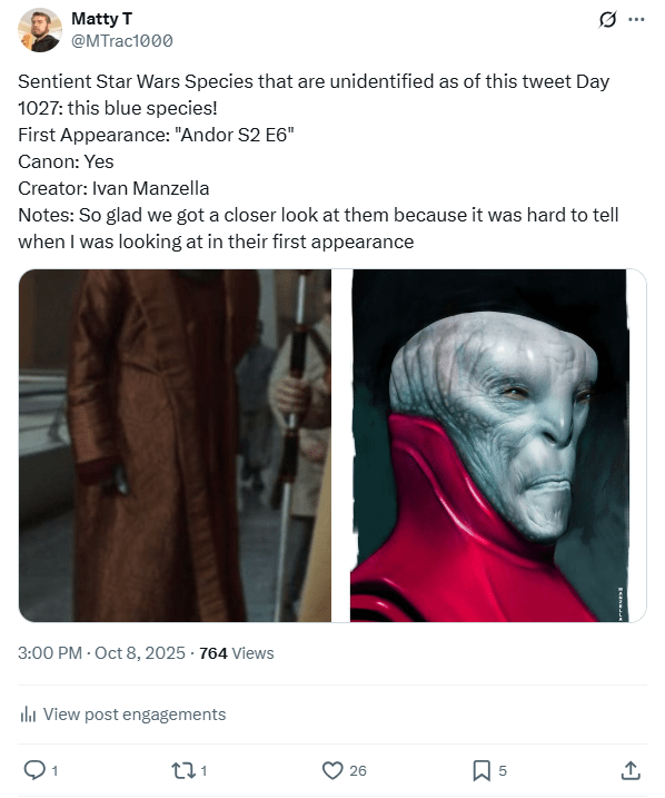 DAY 1040 UPDATE: Had a lot of fun documenting all of the new unidentified Andor S2 aliens on Wookieepedia, and this one was no exception: https://starwars.fandom.com/wiki/Unidentified_wide-nosed_species.