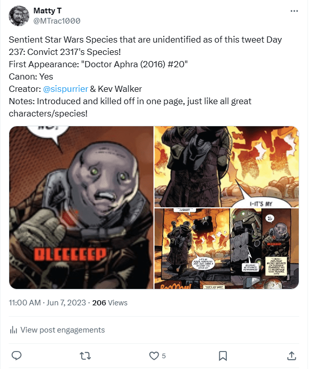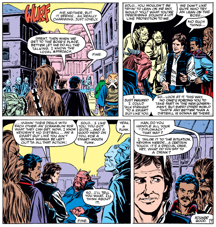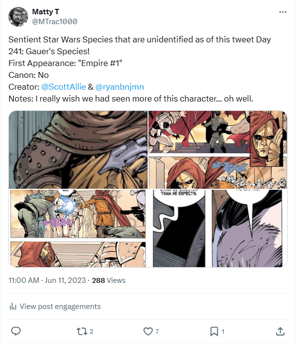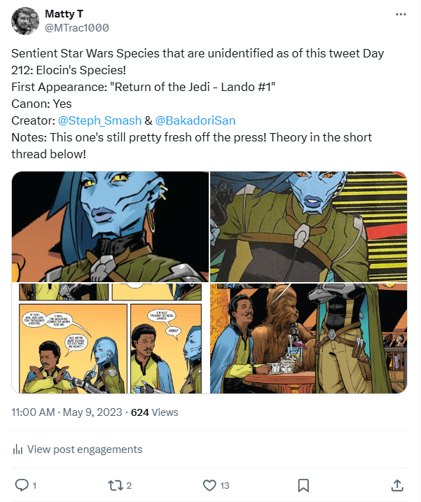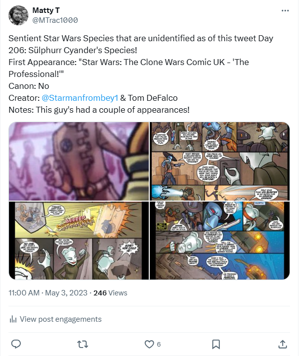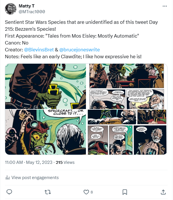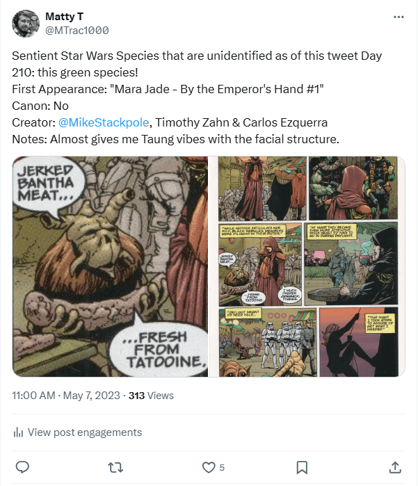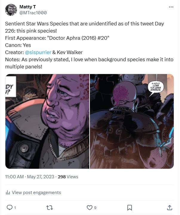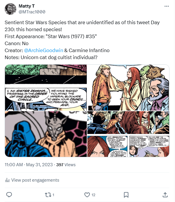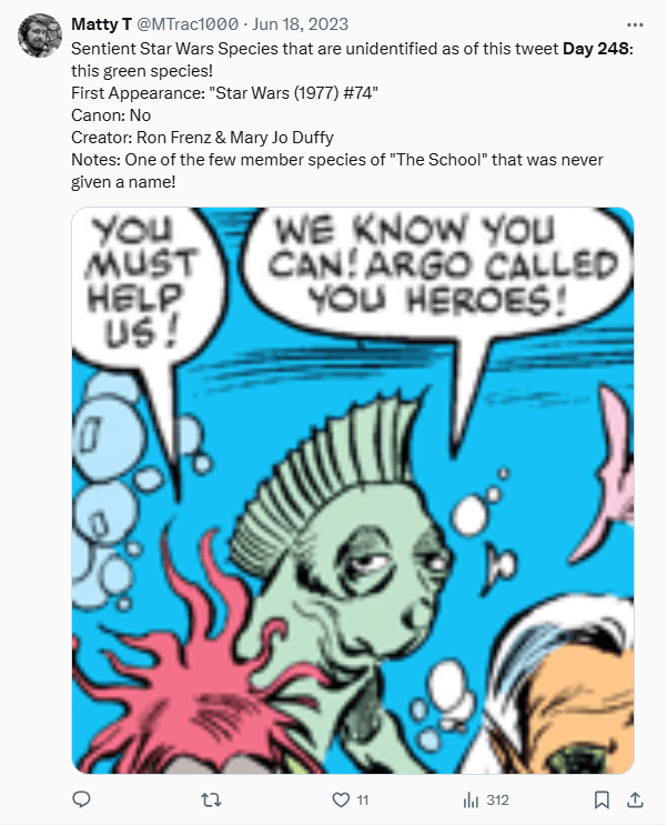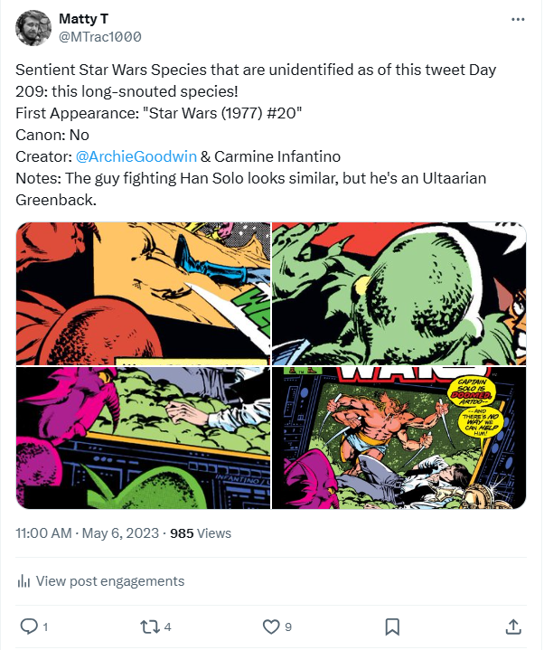 DAY 219 UPDATES: I was eventually made aware that the majority of the tweet was wrong. For starters, the species HAS been named, specifically in the Star Wars Insider #89 article “Underworld: A Galaxy of Scum and Villainy” in 2006. Abel G. Peña and Ryan Kaufman gave them the name “Pinurquian,” earning a spot in the article due to their appearance in “Star Wars (1977) #85,” which brings us to our next correction. Unlike what I stated originally, the species actually appeared five issues earlier (as seen in the image below), debuting in the 1977 Marvel run’s issue #85, not #90. Fortunately, this does not change the creator’s identity, with Bob McLeod and Mary Jo Duffy responsible for both issues.