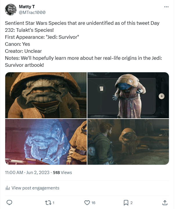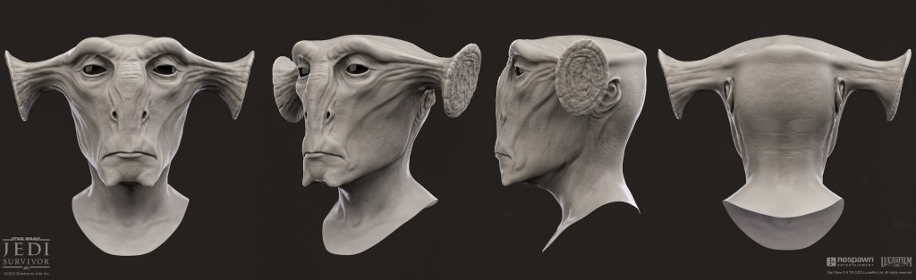 DAY 229 UPDATES: Found some high quality official renders of Grock from Respawn Character Artist Ben Lee on ArtStation: https://www.artstation.com/art_of_ben_lee! When posting them, I also got confirmation from Jake Lunt Davies that this was one of his designs (making all 3 alien heads in the bottom right his designs, the others being the Melbu and “Namara”). When asked if he had the concept art, he revealed that the art did exist, but is still not “cleared” to share publicly and was created hastily, not being of his usual quality. Depending on how detailed it looks, it’s very possible the species’ design was actually finalized by Neal Scanlan and/or members of his team, making the answer to “Who is this species’ creator?” a little bit less straightforward.