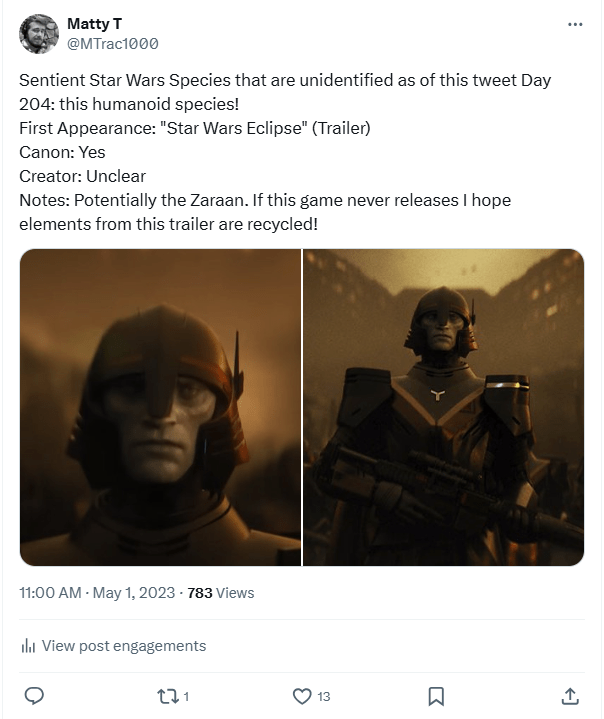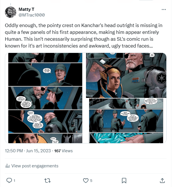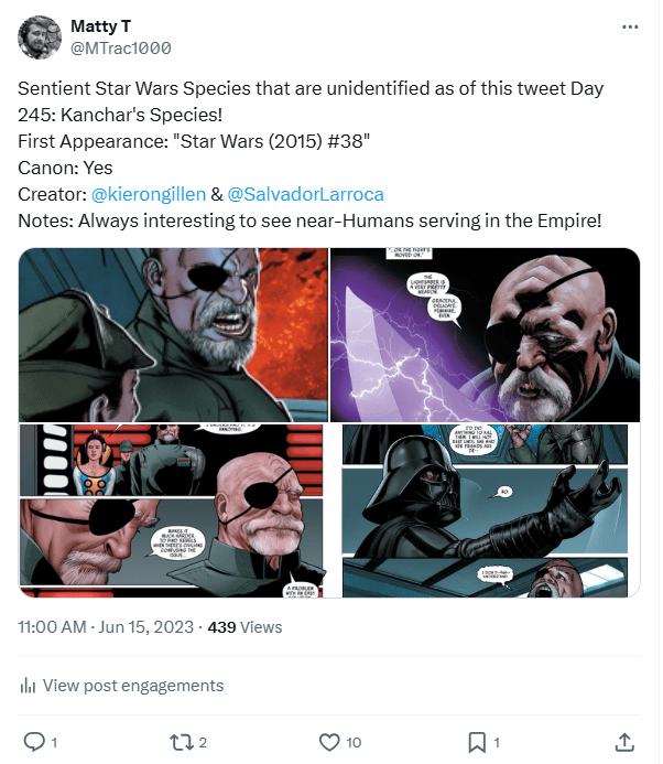 The 2024 Comprehensive Star Wars Encyclopedia strangely identifies Kirak Infil’a as simply being “Human,” though I currently do not accept this idea, as the book seemingly refers to five or six other near-Humans (including the likes of Day 525 and Day 788) as Humans (potentially using the terms interchangeably), so I’ll need to see this reinforced in a separate source before I actually update this field. It is very possible they’re changing how they classify “Humans” behind-the-scenes to better accommodate “almost Humans,” though it’s impossible to say for certain at the moment.