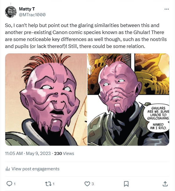 DAY 235 UPDATES: Given the appearance of Ishnar Ti-Kharatal, one of, if not our first depictions of a female Kajain’sa’Nikto, I’m not fairly confident this individual is also a Nikto woman! The beak-like mouth section is still a bit distinct, but that could just be chalked up to differences in artist depictions. I asked Daniel José Older if this was intended to be Ishnar or possibly just another Nikto, and while his answer is a bit vague and confusing, it does make it seem like this is a high possibility.