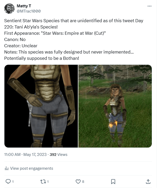 DAY 220 UPDATES: Unlike with all of the “Nothan” species I covered not too long ago (Days 60-62), given the context of where this species originated, it’s very likely this was intended to be an interpretation of a female Bothan. Of course, we can’t say for sure, but it would definitely make sense, ESPECIALLY given the structure of their name and the inclusion of Bothuwai within the game.