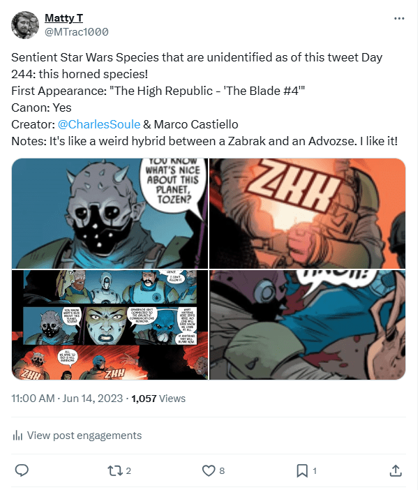 DAY 244 UPDATES: Upon a more intent reread of The Blade, I actually realized that this character, and subsequently this species, appear exactly once in the background of both issues #3 and #2, making “The High Republic – ‘The Blade #2′” their actual first appearance. (I made extra sure they did not appear at any point throughout the first issue.)