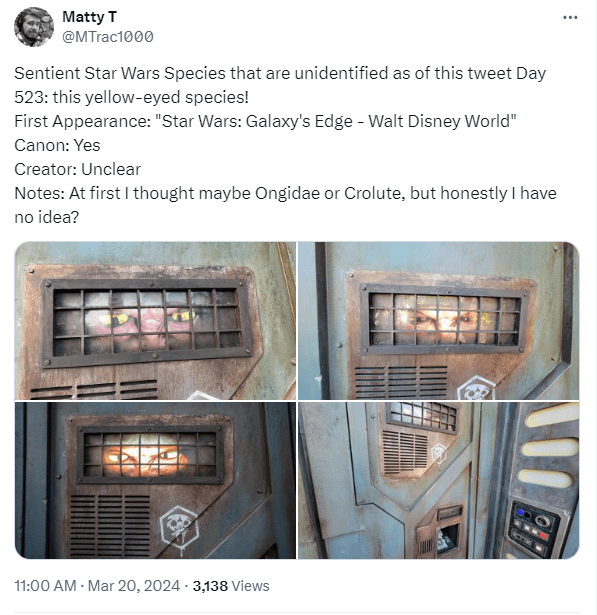 DAY 523 UPDATE: The aforementioned “mistake” was the following tweet regarding a species whose eyes can be seen at Galaxy’s Edge. For some reason I didn’t put together that it was simply a pink-variant Kyuzo like Constable Zuvio, but thankfully my loyal followers were quick to point that out! Turns out the character even has a name: Raga Bua. The more you know!