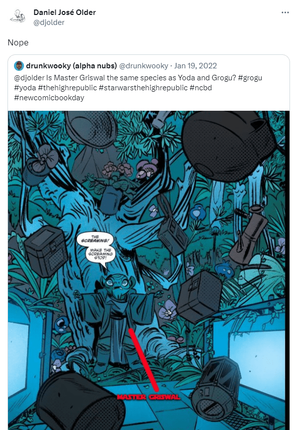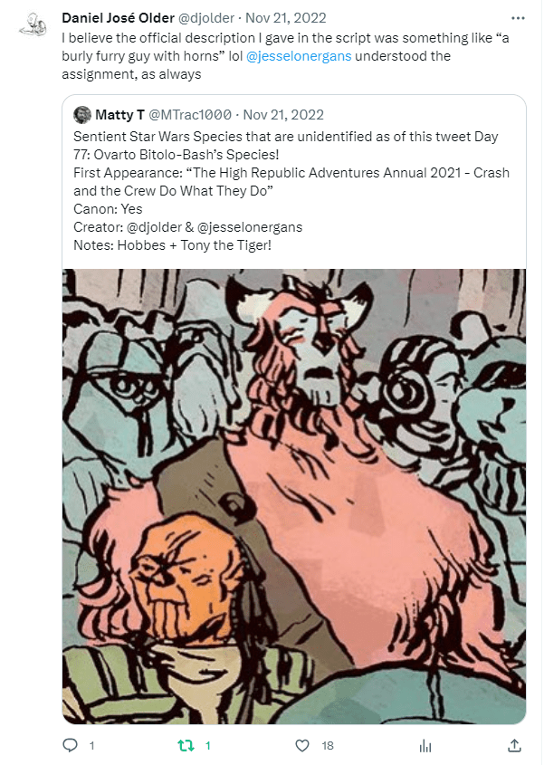 DAY 77 UPDATES: While I interpreted the large objects growing out of the side of Ovarto’s head to be ears, Daniel José Older revealed in a Quote tweet that they are, in fact, horns, ruling out a lot of theories regarding pre-existing feline species.