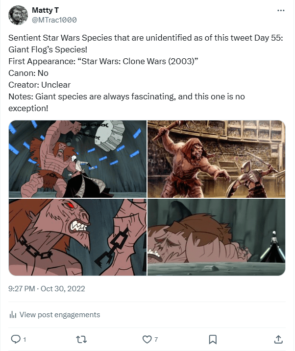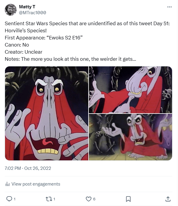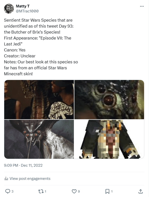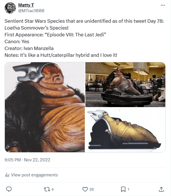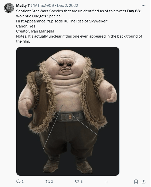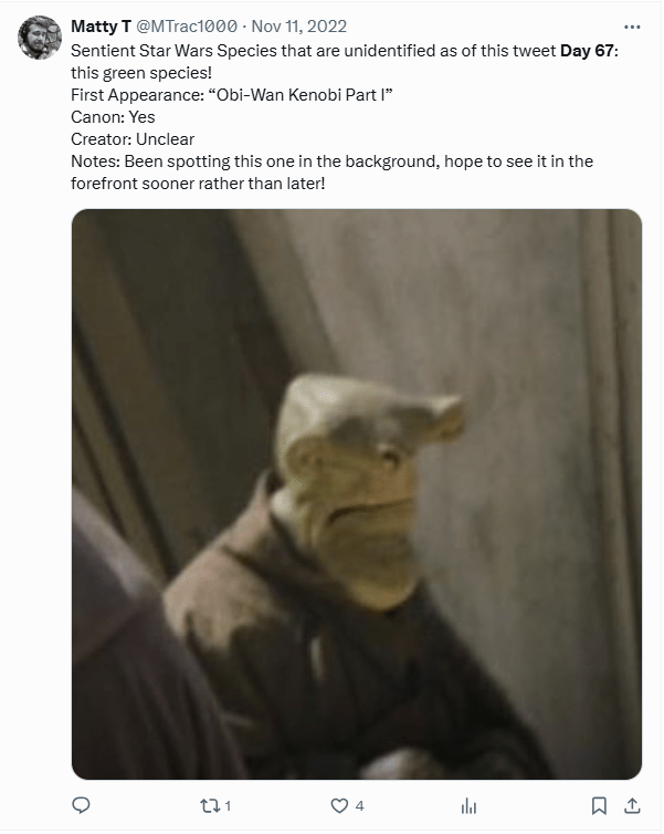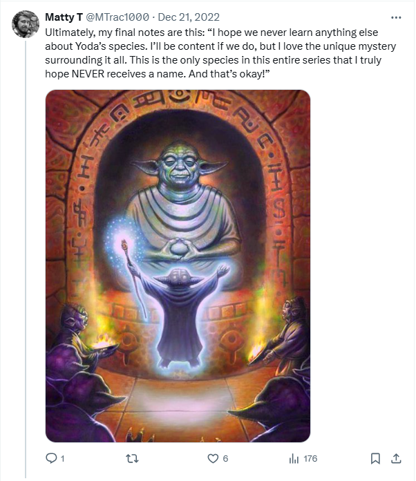 DAY 93 UPDATES: The original tweet formatted funkily for some reason, so I apologize for that. As for the concept artist’s identity, I eventually purchased the art book and learned that it was Ivan Manzella. Additionally, The Butcher of Brix received a 2023 Topps “Creatures & Aliens” collectible trading card from the “Obi-Wan Kenobi” set, which revealed that, for starters, he appeared somewhere in “Obi-Wan Kenobi,” as well as a bit of additional anatomical info in the card’s bio. Unfortunately, this did not bring us anywhere closer to a species name.