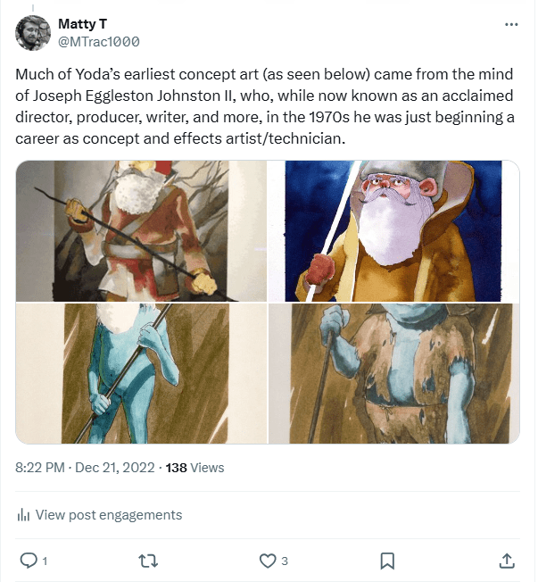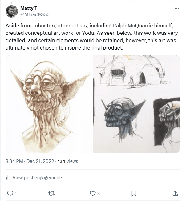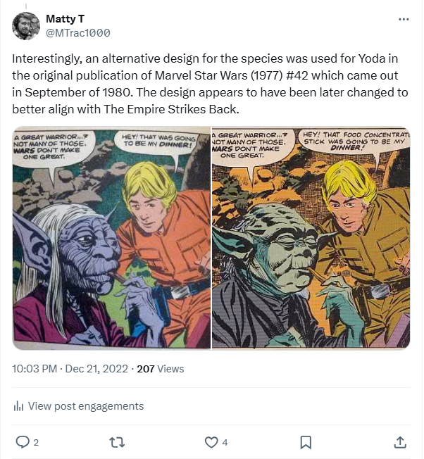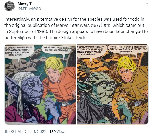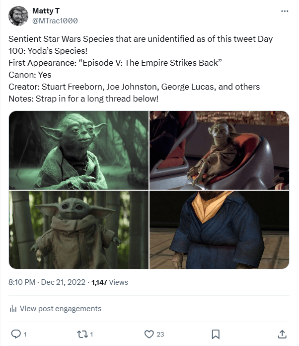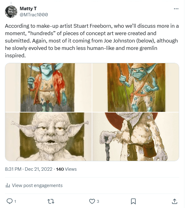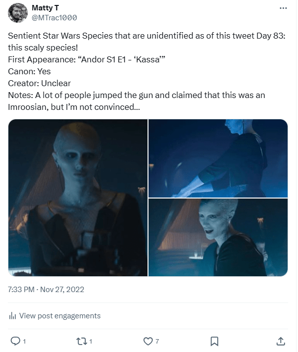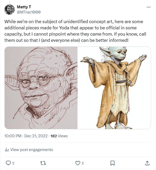 DAY 93 UPDATES: The original tweet formatted funkily for some reason, so I apologize for that. As for the concept artist’s identity, I eventually purchased the art book and learned that it was Ivan Manzella. Additionally, The Butcher of Brix received a 2023 Topps “Creatures & Aliens” collectible trading card from the “Obi-Wan Kenobi” set, which revealed that, for starters, he appeared somewhere in “Obi-Wan Kenobi,” as well as a bit of additional anatomical info in the card’s bio. Unfortunately, this did not bring us anywhere closer to a species name.