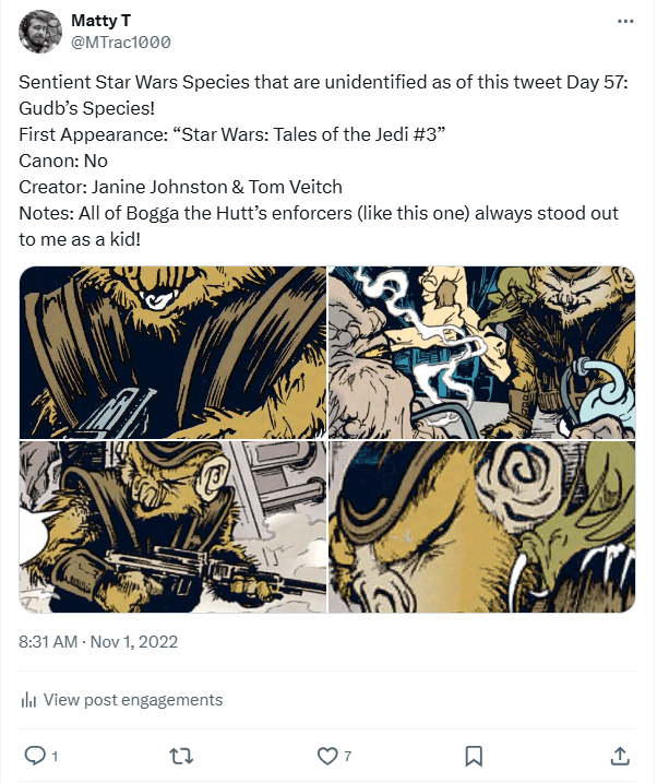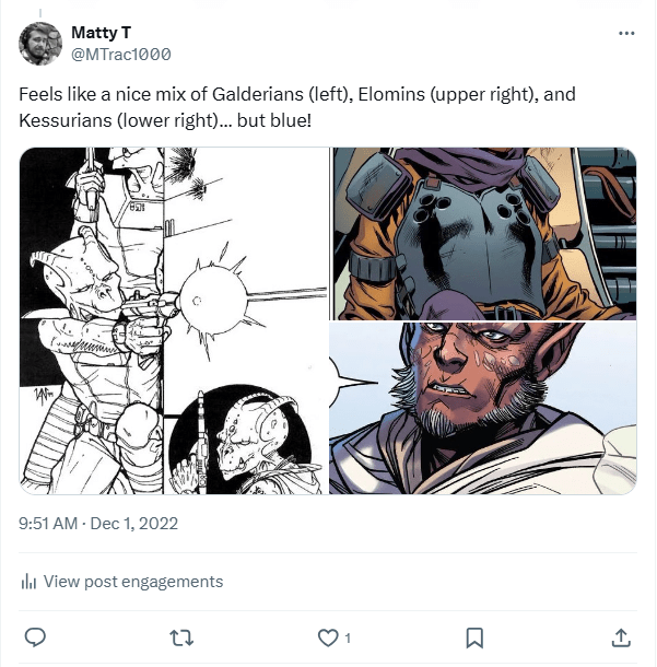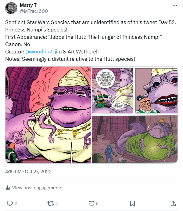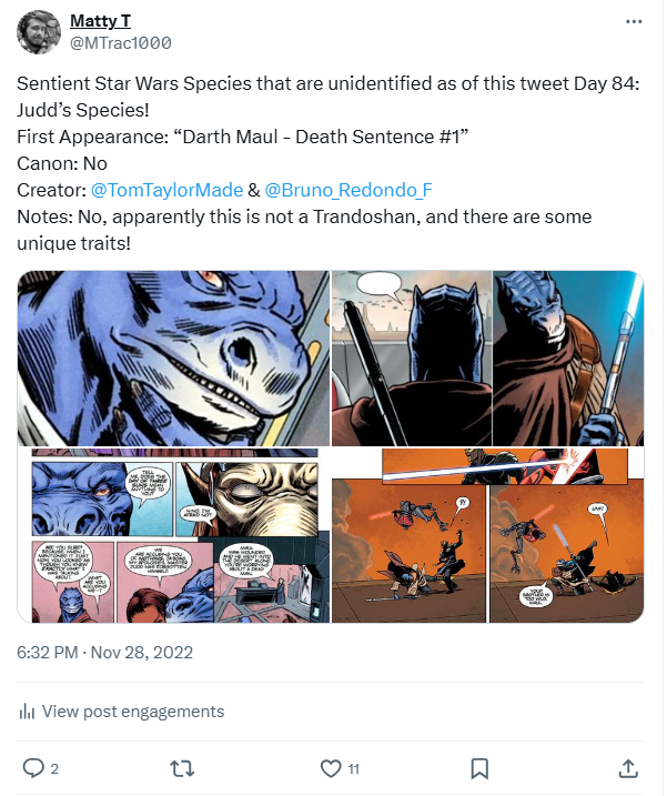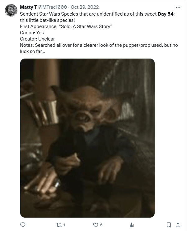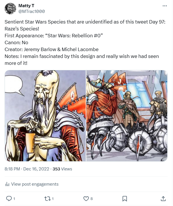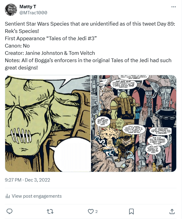 DAY 52 UPDATES: Turns out this species had already appeared in Canon (and was identified) as of this initial tweet. Specifically, they were included in the Star Wars Adventures (2020) #7 short comic “Tales of Villainy: The Crimson Corsair and the Crime Lords of the Barren Rim,” given the name “Orooturooian,” which is consistent with their Legends homeworld, Orooturoo.