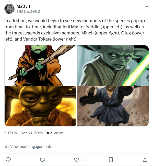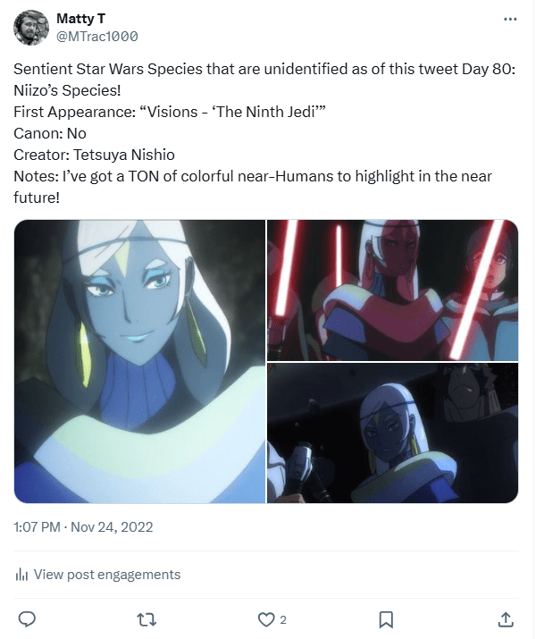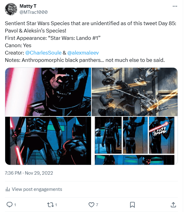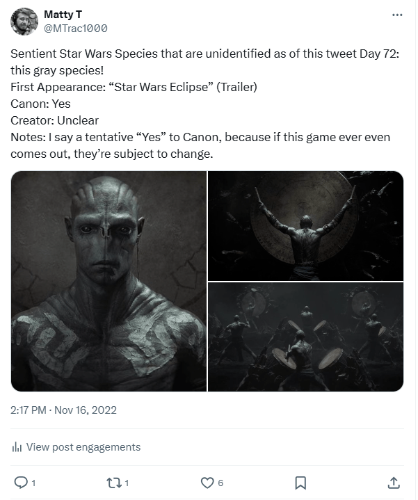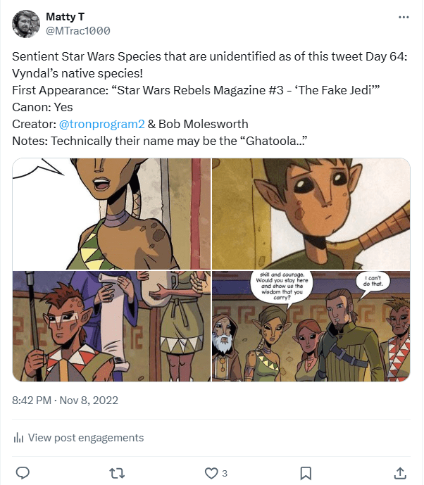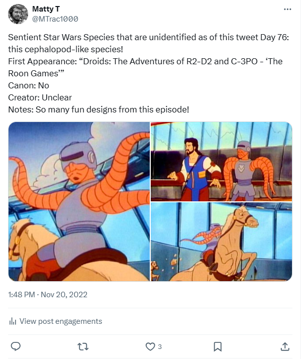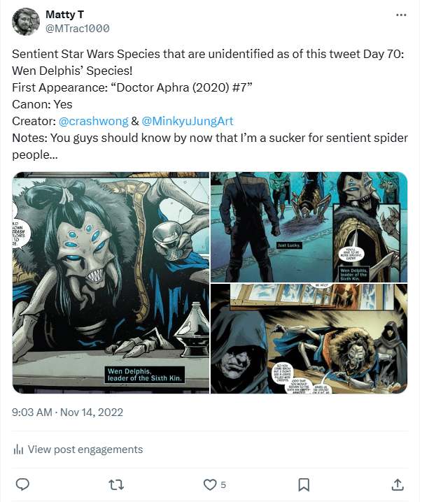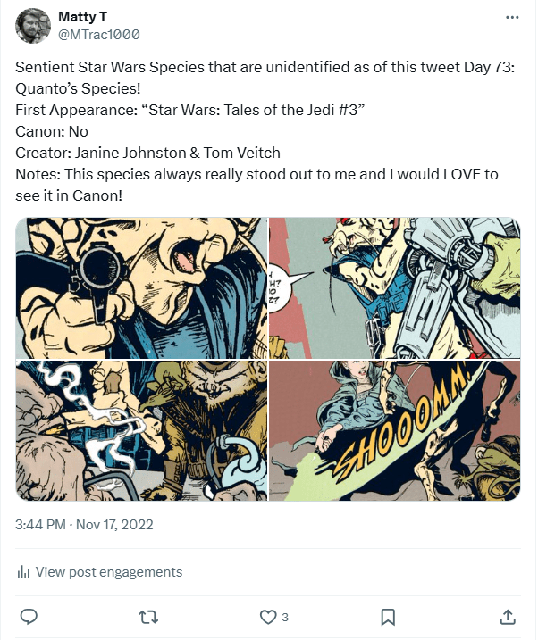 DAY 52 UPDATES: Turns out this species had already appeared in Canon (and was identified) as of this initial tweet. Specifically, they were included in the Star Wars Adventures (2020) #7 short comic “Tales of Villainy: The Crimson Corsair and the Crime Lords of the Barren Rim,” given the name “Orooturooian,” which is consistent with their Legends homeworld, Orooturoo.