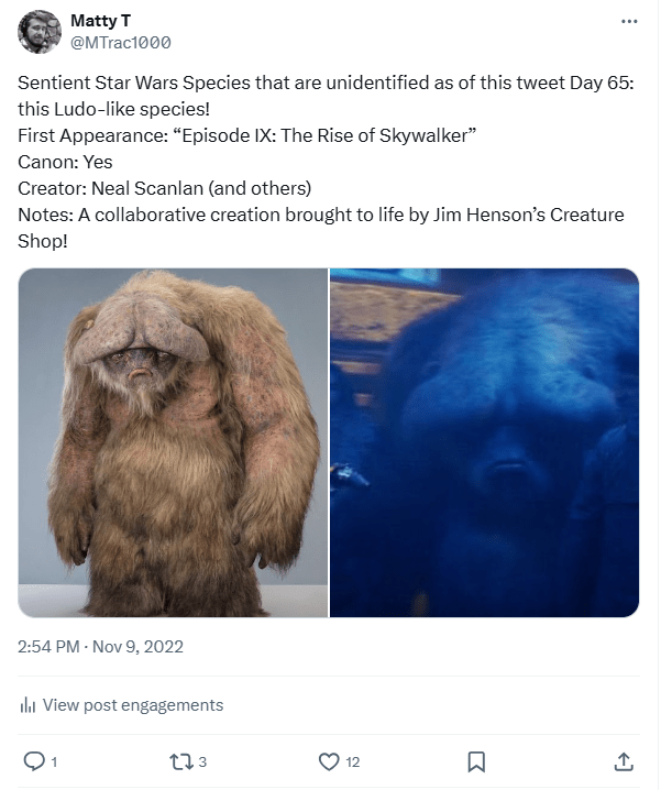 DAY 65 UPDATES: I was able to track down both concept art as well as behind the scenes footage of this species/costume, which confirm Louis Wiltshire as the species’ original inceptor! The TROS artbook also reveals that during production, the species itself was referred to by the codename “Wizard 22.” Here’s their page I created: https://starwars.fandom.com/wiki/Unidentified_hulking_furry_species.