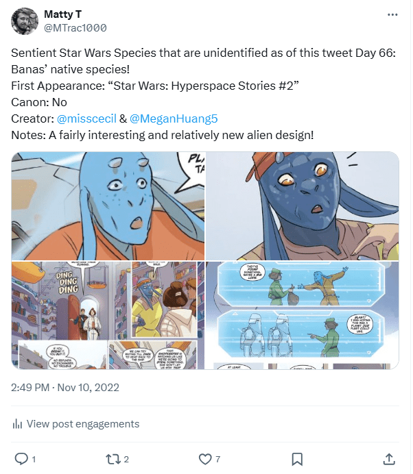 DAY 66 UPDATES: I accidentally mistyped and listed this species’ canonicity status as “No,” however, they are actually exclusive to Star Wars Canon. They have also appeared fairly consistently throughout the Star Wars “Hyperspace Stories” comic limited series, although they have still yet to receive a name. Only a few more issues before we potentially lose our main chance to get one… (news flash, after typing this, they continued to go unnamed until the end of the run).